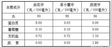 | 主要成分 | 血漿中(克/100毫升) | 腎小囊(克/100毫升) | 尿液中(克/100毫升) |