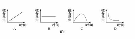 在一個(gè)由林木、植食昆蟲、食蟲鳥組成的森林生態(tài)系統(tǒng)中,如果食蟲鳥被大量捕殺,植食昆蟲的數(shù)量變化可以用圖2中的哪個(gè)曲線圖來(lái)表示?( )
