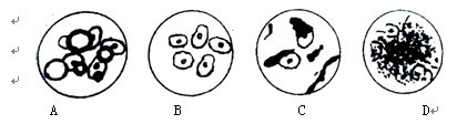 下圖中的A~D是四位同學(xué)在顯微鏡下觀察人口腔上皮細(xì)胞時(shí),出現(xiàn)在視野中的物像。其中最可能是因?yàn)樯w蓋玻片時(shí)操作不當(dāng)而形成的圖像是( )