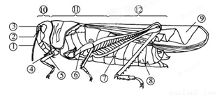 (8分)請觀察蝗蟲的外部形態(tài)圖,回答問題(注意:[。輧(nèi)填數(shù)字, 上填名稱)