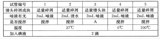 某初中生物興趣小組的同學(xué)在探究“口腔對淀粉的消化作用”課題時,設(shè)計(jì)的實(shí)驗(yàn)方案如下表:請完成下列問題: