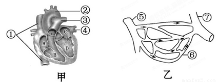 下列兩圖中,甲圖是人體心臟剖面圖,乙圖是人體某組織處局部血管示意圖,請(qǐng)據(jù)圖分析回答以下問(wèn)題:(9分)