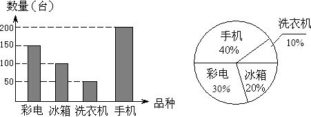 2008年11月28日,為擴(kuò)大內(nèi)需,國(guó)務(wù)院決定在全國(guó)實(shí)施“家電下鄉(xiāng)”政策.第一批列入家電下鄉(xiāng)的產(chǎn)品為彩電、冰箱、洗衣機(jī)和手機(jī)四種產(chǎn)品,某縣一家家電商場(chǎng),今年一季度對(duì)以上四種產(chǎn)品的銷售情況進(jìn)行了統(tǒng)計(jì),繪制了如下的統(tǒng)計(jì)圖,請(qǐng)你根據(jù)統(tǒng)計(jì)圖中的信息解答下列問(wèn)題: