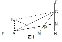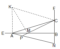 | 解:(1)45°; (2)過點(diǎn)A作AK⊥AB,且AK=CN, 連接CK、MK, ∴四邊形ANCK是平行四邊形, ∵CN=MB, ∴AK=MB ∵AM=CB,∠B=∠KAM ∴△AKM≌△BMC ∴∠AKM=∠BMC,KM=MC ∵∠AKM+∠AMK=90° ∴∠BMC+∠AMK=90° ∴∠KMC=90° ∴△KMC是等腰直角三角形 ∴∠MCK=45° ∵CK∥AN ∴∠APM=∠MCK=45°; (3)過點(diǎn)A作AK⊥AB,且AK=CN, 連接CK、MK ∴四邊形ANCK是平行四邊形 ∵CN=MB, ∴AK=MB ∵AM=CB,∠B=∠KAM ∴△AKM≌△BMC ∴∠AKM=∠BMC,KM=MC ∵∠AKM+∠AMK=90° ∴∠BMC+∠AMK=90° ∴∠KMC=90° ∴△KMC是等腰直角三角形 ∴∠MCK=45° ∵CK∥AN ∴∠APM+∠MCK=180° ∴∠APM=135°。 |