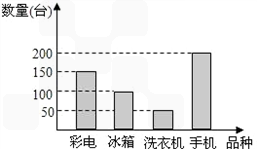 2008年11月28日,為擴(kuò)大內(nèi)需,國(guó)務(wù)院決定在全國(guó)實(shí)施“家電下鄉(xiāng)”政策.第一批列入家電下鄉(xiāng)的產(chǎn)品為彩電、冰箱、洗衣機(jī)和手機(jī)四種產(chǎn)品.某縣一家家電商場(chǎng),今精英家教網(wǎng)年一季度對(duì)以上四種產(chǎn)品的銷(xiāo)售情況進(jìn)行了統(tǒng)計(jì),繪制了如下的統(tǒng)計(jì)圖,請(qǐng)你根據(jù)圖中信息解答下列問(wèn)題: