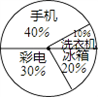 (2)根據(jù)題意可得:手機(jī)有200臺(tái),占40%;則銷(xiāo)售總量為200÷40%=500臺(tái).進(jìn)而求得冰箱有100臺(tái).可補(bǔ)全條形圖.進(jìn)而計(jì)算出彩電占30%,洗衣機(jī)占10%,