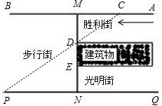 如圖所示,一段街道的兩邊緣所在直線分別為AB、PQ,并且AB∥PQ.建筑物的一端DE所在的直線MN⊥AB于點M,交PQ于點N.小亮從勝利街的A處,沿著AB方向前進,小明一直站在點P的位置等候小亮.