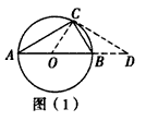 | (2)連接OC,如圖(1)所示, 則OC=OB ∵CD⊥CO, ∴∠OCD=90°, ∵∠BAC=30°, ∴∠COD=2∠BAC=60°, ∴∠D=180°-∠COD-∠OCD=30°, ∴OD=2OC=4, ∴BD=OD-OB=4-2=2(cm), ∴當(dāng)BD長(zhǎng)為2cm時(shí),CD與⊙O相切; |