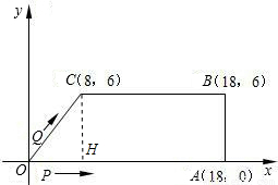 如圖,在直角坐標(biāo)系中,O是原點(diǎn),A、B、C三點(diǎn)的坐標(biāo)分別為A(18,0),B(18,6),C(8,6),四邊形OABC是梯形,點(diǎn)P、Q同時(shí)從原點(diǎn)出發(fā),分別做勻速運(yùn)動(dòng),其中點(diǎn)P沿OA向終點(diǎn)A運(yùn)動(dòng),速度為每秒1個(gè)單位,點(diǎn)Q沿OC、CB向終點(diǎn)B運(yùn)動(dòng),當(dāng)這兩點(diǎn)有一點(diǎn)到達(dá)自己的終點(diǎn)時(shí),另一點(diǎn)也停止運(yùn)動(dòng).