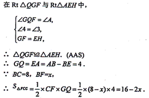 | (3)①如右圖,當(dāng)點(diǎn)F運(yùn)動到使菱形FEHG的頂點(diǎn)H與點(diǎn)A重合時(shí),x取得最小值 畫法如下:以E為圓心,EA為半徑畫弧,交BC邊于點(diǎn)F,平移EA到FG,連接AG,得到四邊形FEHG,可證得四邊形FEHG為菱形。 此時(shí), |