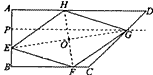 | ②如右圖,當(dāng)點(diǎn)F運(yùn)動到使菱形FEHG的頂點(diǎn)G落在梯形ABCD的CD邊上時(shí),x取得最大值, 畫法如下:在圖6中由GQ=4可知,無論點(diǎn)F在BC邊上如何運(yùn)動,點(diǎn)G到BC及AD的距離不變,分別為4、2,取AE的中點(diǎn)P(AP=2),過點(diǎn)P作BC的平行線,交CD邊于G,作EG的垂直平分線,分別交AD、BC于H、F順次連接F、E、H、G得到四邊形FEHG,可得證四邊形FEHG為菱形。 |