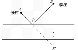 畫一畫:如下圖所示,河流在兩個村莊A、B的附近可以近似地看成是兩條折線段(圖中l),A、B分別在河的兩旁. 現(xiàn)要在河邊修建一個水泵站,同時向A、B兩村供水,為了節(jié)約建設(shè)的費(fèi)用,就要使所鋪設(shè)的管道最