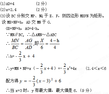 銳角△ABC中,BC=6,S△ABC=12,兩動點M,N分別在邊AB,AC上滑動,且MN∥BC,以MN為邊向下作正方形MPQN,設其邊長為x,正方形MPQN與△ABC公共部分的面積為y,(y>0).