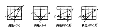 在正方形網(wǎng)格中,小格的頂點叫做格點.小華按下列要求作圖:①在正方形網(wǎng)格的三條不同實線上各取一個格點,使其中任意兩點不在同一條實線上;②聯(lián)結(jié)三個格點,使之構(gòu)成直角三角形,小華在左邊的正方形網(wǎng)格中作出了Rt△ABC,請求出斜邊AC的長.請你按照同樣的要求,在右邊的兩個正方形網(wǎng)格中各畫出一個直角三角形,使三個網(wǎng)格中的直角三角形互不全等,并分別求出這三個直角三角形的斜邊長.![]()