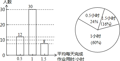 (2)根據(jù)總數(shù)÷人數(shù)×100%=所占百分比可得到平均每天完成作業(yè)用1小時的人數(shù)和平均每天完成作業(yè)用1.5小時的人數(shù)所占百分比,畫出圖形即可;