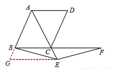 在菱形ABCD中,∠ABC=60°,E是對角線AC上一點,F(xiàn)是線段BC延長線上一點,且CF=AE,連接BE、EF。