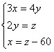 甲、乙、丙三種筐,筐內(nèi)裝有同樣的球,但球數(shù)不等,三只甲筐裝的球數(shù)與四只乙筐裝的球數(shù)相同,兩只乙筐裝的球數(shù)剛好等于一只丙筐裝的球數(shù),一只甲筐比一只丙筐少裝60個球,一只乙筐裝多少個球?