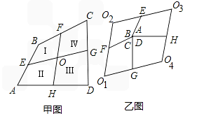 王老師出了一道操作探究題:已知凸四邊形ABCD(如甲圖)紙片,能否將凸四邊形紙片剪兩刀,分割成四塊,然后再拼成一個(gè)平行四邊形?![]()