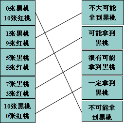 下面第一排表示了十張撲克牌中不同情況,任意摸一張,請(qǐng)你用第二排的語(yǔ)言來(lái)描述摸到紅色撲克牌的可能性大小,并用線連起來(lái).
