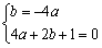 | 解:(1)由拋物線過(guò)B(0,1) 得c=1, 又b=-4ac,頂點(diǎn)A(- ∴- 將A點(diǎn)坐標(biāo)代入拋物線解析式,得4a+2b+1=0, ∴ 解得:a= 所以,拋物線的解析式為y= |