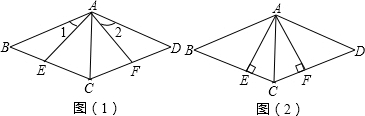 如圖,AC是菱形ABCD的對角線,點E、F分別在邊AB、AD上,且AE=AF.試說明△ACE≌△ACF.![]()