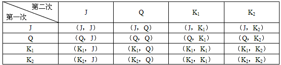 甲乙兩名同學(xué)做摸牌游戲。他們?cè)谧郎戏帕艘桓睋淇酥袊?guó)的4張牌,牌面分別是J,Q,K,K;游戲規(guī)則是:將牌面全部朝下,從這4張牌中隨機(jī)取1張牌記下結(jié)果放回,洗勻后再隨機(jī)取一張牌;若兩次取出的牌中都沒(méi)有K,則甲獲勝,否則乙獲勝。你認(rèn)為甲乙兩人誰(shuí)獲勝的可能性大?用列表或畫樹(shù)狀圖的方法說(shuō)明理由