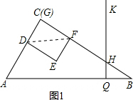(3)當QK經(jīng)過矩形DEFG的對稱中心O時,就可以把矩形DEFG分成面積相等的兩部分;易得∠GFD=∠B,可得DF∥AB,然后根據(jù)平行線分線段成比例定理求出t值;
