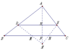 如圖,在△ABC中,∠A=90°,BC=10,△ABC的面積為25,點D為AB邊上的任意一點(D不與A、B重合),過點D作DE∥BC,交AC于點E,設(shè)DE=x,以DE為折線將△ADE翻折(使△ADE落在四邊形DBCE所在的平面內(nèi)),所得的△A'DE與梯形DBCE重疊部分的面積記為y。