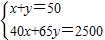 【答案】分析:(1)根據(jù)題意可得等量關(guān)系:A、B兩種新型節(jié)能臺燈共50盞,A種新型節(jié)能臺燈的臺數(shù)×40+B種新型節(jié)能臺燈的臺數(shù)×60=2500元;設(shè)A型臺燈購進x盞,B型臺燈購進y盞,列方程組即可求得;