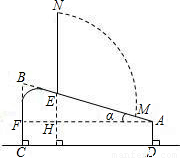 圖1是小明在健身器材上進(jìn)行仰臥起坐鍛煉時(shí)情景.圖2是小明鍛煉時(shí)上半身由EN 位置運(yùn)動(dòng)到與地面垂直的EM位置時(shí)的示意圖.已知BC=0.64米,AD=0.24米,α=18°.(sin18°≈0.31,cos18°≈0.95,tan18°≈0.32)![]()