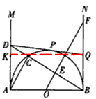 | (3)由(2)知,△ABD∽△BFO, ∴ ∴ ∵DPQ是半圓O的切線, ∴AD=DP,QB=BQ, 過(guò)Q點(diǎn)作AM的垂線QK,垂足為K, 在Rt△DQK中, DQ2=QK2+DK2, ∴(AD+BQ)2=22+(AD-BQ)2, ∴ ∴BF=2BQ, ∴Q為BF的中點(diǎn)。 |