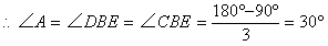 已知:如圖,△ABC中,∠C=90°,沿過(guò)點(diǎn)B的一條直線BE折疊△ABC,點(diǎn)C恰好落在AB的中點(diǎn)D處,求∠A的度數(shù)。