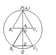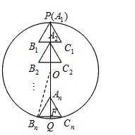 如圖,已知⊙O的半徑為1,PQ是⊙O的直徑,n個相同的正三角形沿PQ排成一列,所有正三角形都關于PQ對稱,其中第一個△A1B1C1的頂點A1與點P重合,第二個△A2B2C2的頂點A2是B1C1與PQ的交點,…,最后一個△AnBnCn的頂點Bn、Cn在圓上。