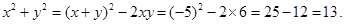 若x + y =-5,xy = 6,則x2 + y2=           .