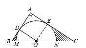 | (2)解:如圖,設(shè)⊙O與BC交于M、N兩點, 由(1)得:四邊形ADOE是正方形, ∴∠DOE=90°, ∴∠COE+∠BOD=90°, ∵在Rt△EOC中, ∴ ∴S扇形DOM+S扇形EON=S扇形DOE= ∴S陰影=S△BOD+S△COE﹣(S扇形DOM+S扇形EON)= 答:圖中兩部分陰影面積的和為 |
