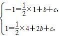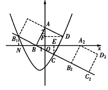 | 解:(1)如圖,過點C作CE⊥x軸于點E,過點D作DF⊥y軸于點F, ∵正方形ABCD中,AB=BC,∠ABC=∠AOB=90°, 即∠1+∠ABO=∠2+∠ABO=90°, ∴∠1=∠2, 在Rt△BCE和Rt△ABO中, ∵∠1=∠2,BC=AB,∠CEB=∠BOA=90°, ∴Rt△BCE≌Rt△ABO, ∴CE=BO,BE=AO, ∵B(-1,0), ∴BO=1, ∵AB= ∴在Rt△ABO中,由勾股定理,得AO= ∴CE=1,BE=2, ∴OE=BE-BO=1, ∴C(1,-1), 同理可得△ADF≌△ABO, ∴DF=AO=2,AF=BO=1, ∴OF=AO-AF=2-1=1, ∴D(2,1), 將C(1,-1)、D(2,1)分別代入y= 可得 解得 ∴此拋物線的表達(dá)式為y= |