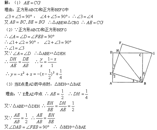如圖,正方形ABCD的邊長是1,點E是AD邊上的點,它從點A沿AD向點D運動,以BE為邊,在BE的上方作正方形BEFG,連結(jié)CG。請?zhí)骄浚?BR>(1)線段AE與CG是否相等?請說明理由。