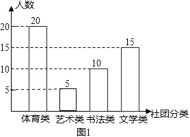 為豐富學(xué)生的課余生活,陶冶學(xué)生的情趣和愛(ài)好,重慶一中初2012級(jí)開(kāi)展了學(xué)生社團(tuán)活動(dòng).年級(jí)為了解學(xué)生分類參加情況,進(jìn)行了抽樣調(diào)查,制作出如下的統(tǒng)計(jì)圖.