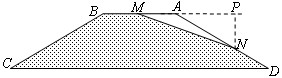 | 解:(1)過(guò)點(diǎn)N作BA的垂線NP,交BA的延長(zhǎng)線于點(diǎn)P 由已知,AM=x,AN=20-x ∵四邊形ABCD是等腰梯形,AB∥CD,∠D=∠C=30°, ∴∠PAN=∠D=30°, 在Rt△APN中,PN=ANsin∠PAN= 即點(diǎn)N到AB的距離為 ∵點(diǎn)N在AD上,0≤x≤20,點(diǎn)M在AB上,0≤x≤15, ∴x的取值范圍是:0≤x≤15。 |