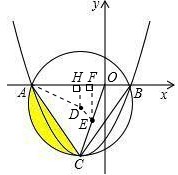 | 解:(1)如圖,作CH⊥x軸,垂足為H, ∵直線CH為拋物線對(duì)稱軸, ∴CH垂直平分AB, ∴CH必經(jīng)過圓心D(-2,-2) ∵DC=4, ∴CH=6 ∴C點(diǎn)的坐標(biāo)為(-2,-6)。 (2)連接AD 在Rt△ADH中,AD=4,DH=2, ∴∠HAD=30°, ∴ ∴ ∴陰影部分的面積 (3)又∵ H點(diǎn)坐標(biāo)為(-2,0),H為AB的中點(diǎn), ∴A點(diǎn)坐標(biāo)為(-2-2 又∵拋物線頂點(diǎn)C的坐標(biāo)為(-2,-6), 設(shè)拋物線解析式為y=a(x+2)2-6 ∵B( ∴ ∴拋物線的解析式為 設(shè)OC的中點(diǎn)為E,過E作EF⊥x軸,垂足為F,連接DE, ∵CH⊥x軸,EF⊥x軸, ∴CH∥EF ∵E為OC的中點(diǎn), ∴ 即點(diǎn)E的坐標(biāo)為(-1,-3)。 設(shè)直線DE的解析式為 ∴ ∴直線DE的解析式為y=-x-4 若存在P點(diǎn)滿足已知條件,則P點(diǎn)必在直線DE和拋物線上 設(shè)點(diǎn)P的坐標(biāo)為(m,n), ∴n=-m-4,即點(diǎn)P坐標(biāo)為(m,-m-4), ∴ 解這個(gè)方程,得 ∴點(diǎn)P的坐標(biāo)為(0,-4)和(-6,2)。 故在拋物線上存在點(diǎn)P,使DP所在直線平分線段OC。 |