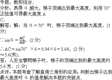 生活經(jīng)驗表明,靠墻擺放的梯子,當50°≤α≤70°時(α為梯子與地面所成的角),能夠使人安全攀爬.現(xiàn)在有一長為6米的梯子AB,試求能夠使人安全攀爬時,梯子的頂端能達到的最大高度AC.(結(jié)果保留兩個有效數(shù)字,sin70°≈0.94,sin50°≈0.77,cos70°≈0.34,cos50°≈0.64)
