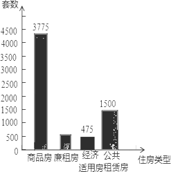 據(jù)衢州市2011年國(guó)民經(jīng)濟(jì)和社會(huì)發(fā)展統(tǒng)計(jì)公報(bào)顯示,2011年衢州市新開工的住房有商品房、廉租房、經(jīng)濟(jì)適用房和公共租賃房四種類型.老王對(duì)這四種新開工的住房套數(shù)和比例進(jìn)行了統(tǒng)計(jì),并將統(tǒng)計(jì)結(jié)果繪制成下面兩幅統(tǒng)計(jì)圖,請(qǐng)你結(jié)合圖中所給信息解答下列問題:![]()