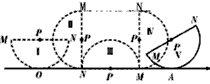如圖,有一直徑MN=4的半圓形紙片,其圓心為點P,從初始位置Ⅰ開始,在無滑動的情況下沿數(shù)軸向右翻滾至位置Ⅴ,其中,位置Ⅰ中的MN平行于數(shù)軸,且半⊙P與數(shù)軸相切于原點O;位置Ⅱ和位置Ⅳ中的MN垂直于數(shù)軸;位置Ⅲ中的MN在數(shù)軸上;位置Ⅴ中的點N到數(shù)軸的距離為3,且半⊙P與數(shù)軸相切于點A.