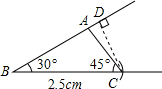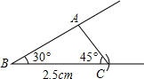 分析:(1)先畫射線BC,在以B為原點(diǎn)以BC為角的一邊作∠B=30°,截取線段BC=2.5cm,再以C為原點(diǎn),CB為角的一邊作∠C=45°,使∠C的另一邊與∠B的邊相交于點(diǎn)A,則△ABC即為所求;