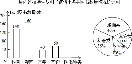 某校為了滿足學生借閱圖書的需求,計劃購買一批新書,為此可,該校圖書管理員對一周內(nèi)本校學生從圖書館借出各類圖書的數(shù)量進行了統(tǒng)計,結(jié)果如下圖.