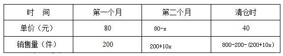 某批發(fā)商以每件50元的價(jià)格購(gòu)進(jìn)800件T恤,第一個(gè)月以單價(jià)80元銷售,售出了200件;第二個(gè)月如果單價(jià)不變,預(yù)計(jì)仍可售出200件,批發(fā)商為增加銷售量,決定降價(jià)銷售,根據(jù)市場(chǎng)調(diào)查,單價(jià)每降低1元,可多售出10件,但最低單價(jià)應(yīng)高于購(gòu)進(jìn)的價(jià)格;第二個(gè)月結(jié)束后,批發(fā)商將對(duì)剩余的T恤一次性清倉(cāng)銷售,清倉(cāng)是單價(jià)為40元,設(shè)第二個(gè)月單價(jià)降低
