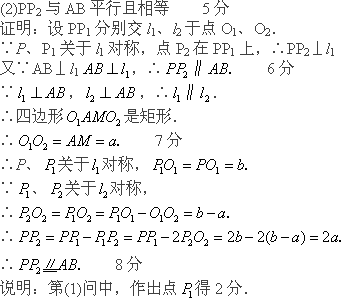 (1)作出點P關(guān)于l1的對稱點P1,并在PP1上取一點P2,使點P2、P1關(guān)于l2對稱;