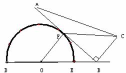 將一個(gè)量角器和一個(gè)含30度角的直角三角板如圖(1)放置,圖(2)是由他抽象出的幾何圖形,其中點(diǎn)B在半圓O的直徑DE的延長(zhǎng)線上,AB切半圓O于點(diǎn)F,且BC=OD。