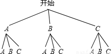 在畢業(yè)晚會上,同學(xué)們表演哪一類型的節(jié)目由自己摸球來決定.在一個不透明的口袋中,裝有除標(biāo)號外其它完全相同的A、B、C三個小球,表演節(jié)目前,先從袋中摸球一次(摸球后又放回袋中),如果摸到的是A球,則表演唱歌;如果摸到的是B球,則表演跳舞;如果摸到的是C球,則表演朗誦.若小明要表演兩個節(jié)目,則他表演的節(jié)目不是同一類型的概率是多少?