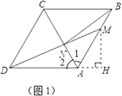| 解:(1)①證明:∵四邊形ABCD是菱形, ∴AB=AD,∠1=∠2. 又∵AN=AN, ∴△ABN≌△ADN. ②作MH?DA交DA的延長(zhǎng)線(xiàn)于點(diǎn)H.由AD∥BC,得∠MAH=∠ABC=60°. 在Rt△AMH中,MH=AMsin60°=4?sin60°=2 ∴點(diǎn)M到AD的距離為2 ∴AH=2.?DH=6+2=8. 在Rt△DMH中,tan∠MDH= 由①知,∠MDH=∠ABN=α,∴tanα= |